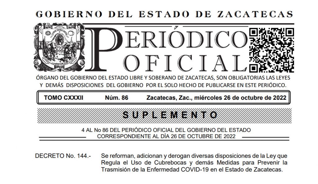 ▪️Se reformó y se derogaron diversos artículos de la Ley que Regula el Uso de Cubrebocas en el Estado de Zacatecas