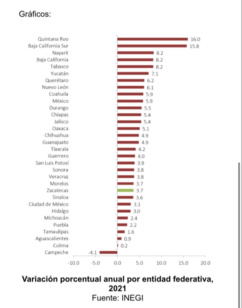 Zacatecas, Zac., 08 de diciembre de 2022.- De acuerdo con las cifras preliminares publicadas por el Instituto Nacional de Estadística y Geografía (Inegi), en 2021, Zacatecas tuvo un aumento de 3.7 por ciento en su Producto Interno Bruto Estatal (PIBE), alcanzando los 150 mil 781.6 millones de pesos (cifras a valores constantes), lo que ubica a la entidad por encima de Aguascalientes y Michoacán.