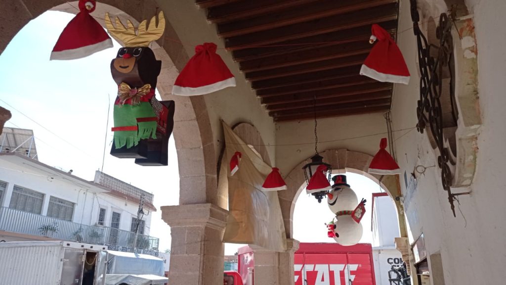 Son justamente las 45 piñatas que adornan la arquería del inmueble, en donde además se colocaron 400 bolos dentro de unos gorros, también con motivo navideño, mismos que son parte de los adornos; el 6 de enero se pretende hacer la fiesta para romper algunas piñatas y el resto obsequiarlas a la población, al igual que los bolos.