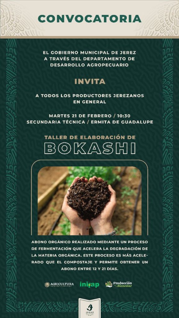 Jerez, Zac.- Con el firme objetivo de apoyar a los productores jerezanos, al mismo tiempo que seguir el Plan Municipal de Desarrollo, el gobierno municipal de Jerez, a través del departamento de Desarrollo Agropecuario, hace extensiva la invitación al “Curso Taller de Elaboración de Bokashi”, este martes 21 de febrero, a las 10:00 horas, en las instalaciones de la Escuela Secundaria Técnica 38 ubicada en las comunidad de la Ermita de Guadalupe, a unos minutos de la cabecera municipal.