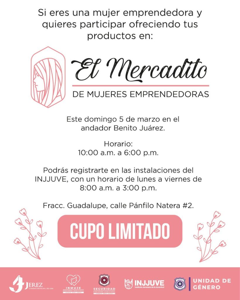 Jerez, Zac.- En busca del fortalecimiento de la economía jerezana y en coherencia con las conmemoraciones programadas para el marco del 8 de marzo, Día Internacional de la Mujer, la actual administración municipal, a través del Instituto Jerezano de la Juventud (INJJUVE), en coordinación con el Instituto del Mujer Jerezana (INMUJE) y Seguridad Pública Municipal, invita a la población jerezana al Mercadito de Mujeres Emprendedoras este próximo domingo 5 de marzo, en el andador Benito Juárez.