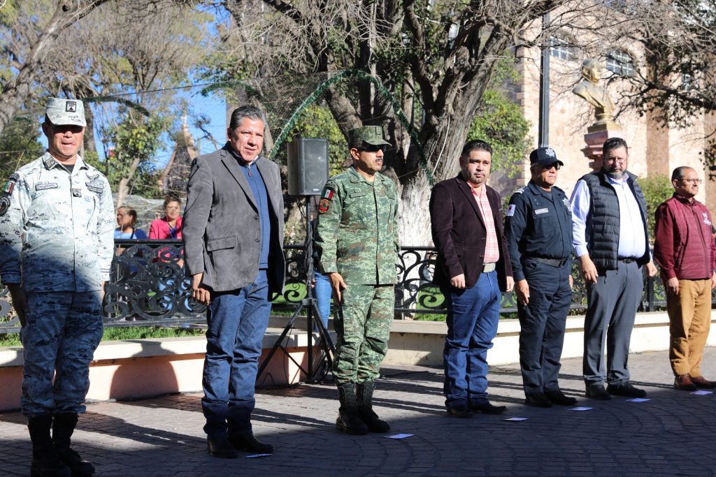 Su participación y su presencia en este estado nos fortalece en la lucha que hemos emprendido para recuperar la paz y la seguridad de este estado, comentó en el jardín principal de Sain Alto durante la ceremonia de Honores a la Bandera.