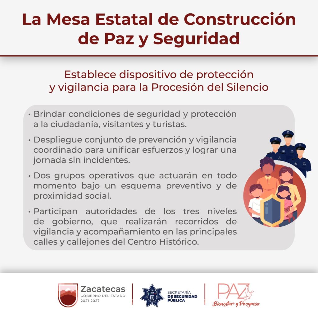 Zacatecas, Zac., 7 de abril de 2023.- Con un despliegue conjunto de prevención y vigilancia que permita desarrollar la Procesión del Silencio 2023, la cual forma parte de las actividades del Festival Cultural Zacatecas 2023, y su disfrute tanto para asistentes como para espectadores, la Mesa Estatal de Construcción de Paz y Seguridad establecerá un dispositivo de protección.
