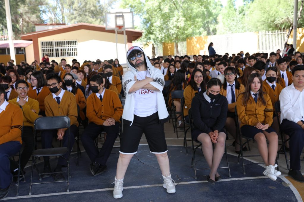 Luego de presentarse ante los jóvenes como primo del cantante Bad Bunny e interpretar algunas de sus canciones, “Bad Ponle… Salud a tu Vida” advierte a los estudiantes que “el fentanilo mata, mi hermano no lo sabía y hoy está muerto”.