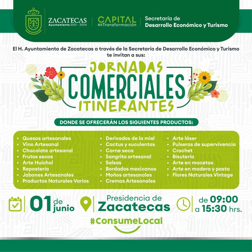 A través de la Secretaría de Desarrollo Económico y Turismo, el Ayuntamiento de Zacatecas realizará una edición más de las Jornadas Comerciales Itinerantes en el patio principal de la presidencia municipal.