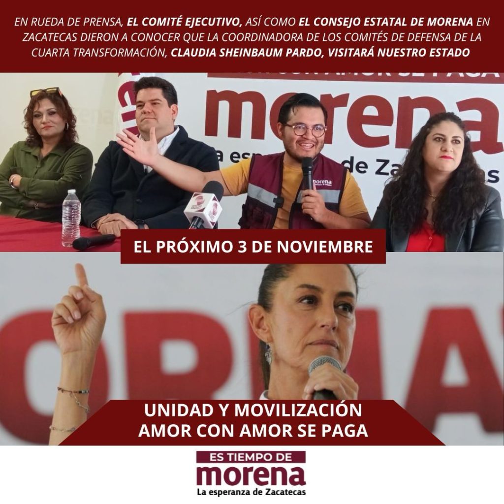 El próximo 3 de noviembre la Coordinadora de los Comités de Defensa de la Cuarta Transformación, la Dra. Claudia Sheinbaum Pardo, visitará territorio zacatecano, así lo dieron a conocer en rueda de prensa representantes del Comité Ejecutivo y del Consejo Estatal de Morena en Zacatecas.