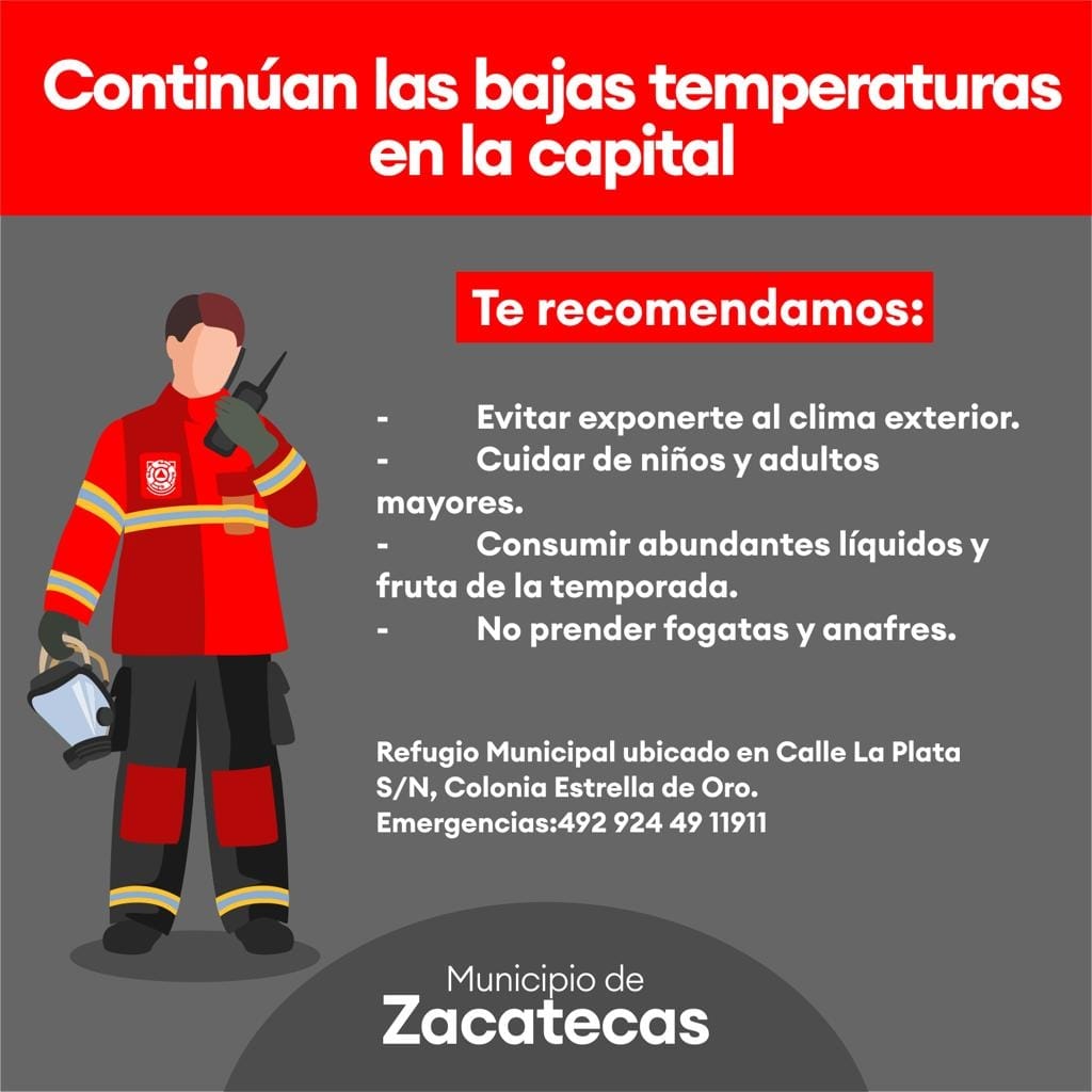 La Dirección de Protección Civil del Municipio de Zacatecas continúa exhortando a las y los ciudadanos a privilegiar la salud ante posibles enfermedades respiratorias que aumentan con la llegada de las bajas temperaturas.