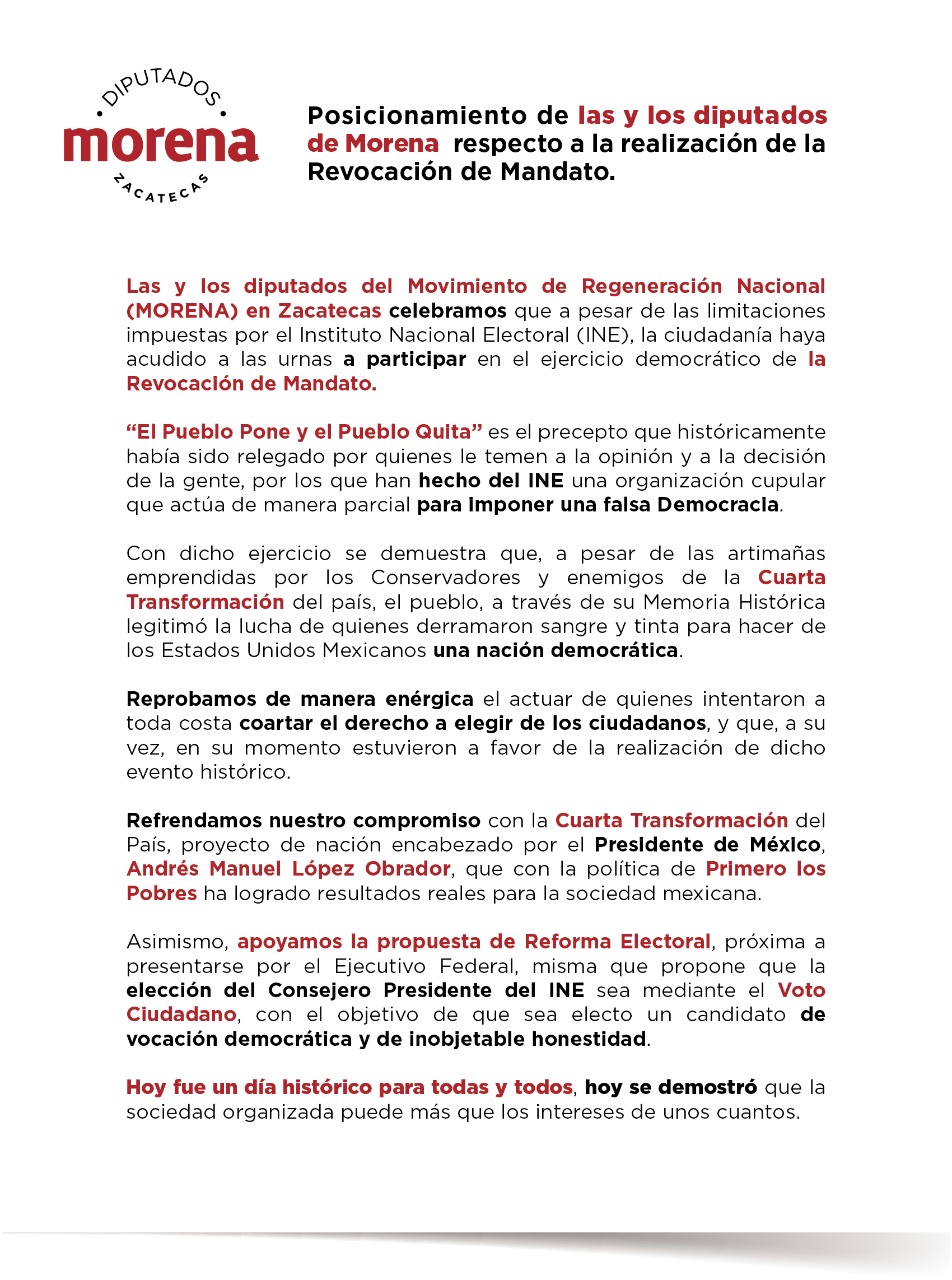 Las y los diputados del Movimiento de Regeneración Nacional (MORENA) en Zacatecas celebramos que a pesar de las limitaciones impuestas por el Instituto Nacional Electoral (INE), la ciudadanía haya acudido a las urnas a participar en el ejercicio democrático de la Revocación de Mandato.