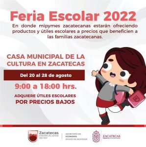 Del 20 al 28 de agosto, con un horario de 9:00 de la mañana a 8:00 de la noche, la Feria Escolar representa un incentivo para las mipymes zacatecanas que producen y comercializan productos dirigidos al sector escolar.