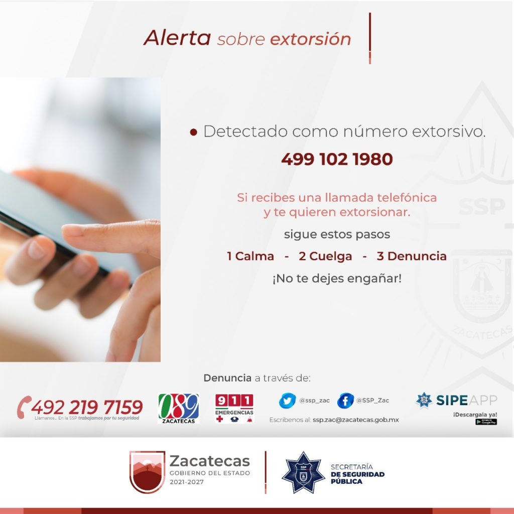 La línea telefónica, desde la que se recibieron las llamadas de extorsión corresponde al número 4991021980, número que se difunde a fin de evitar que más personas sean víctimas de este delito.